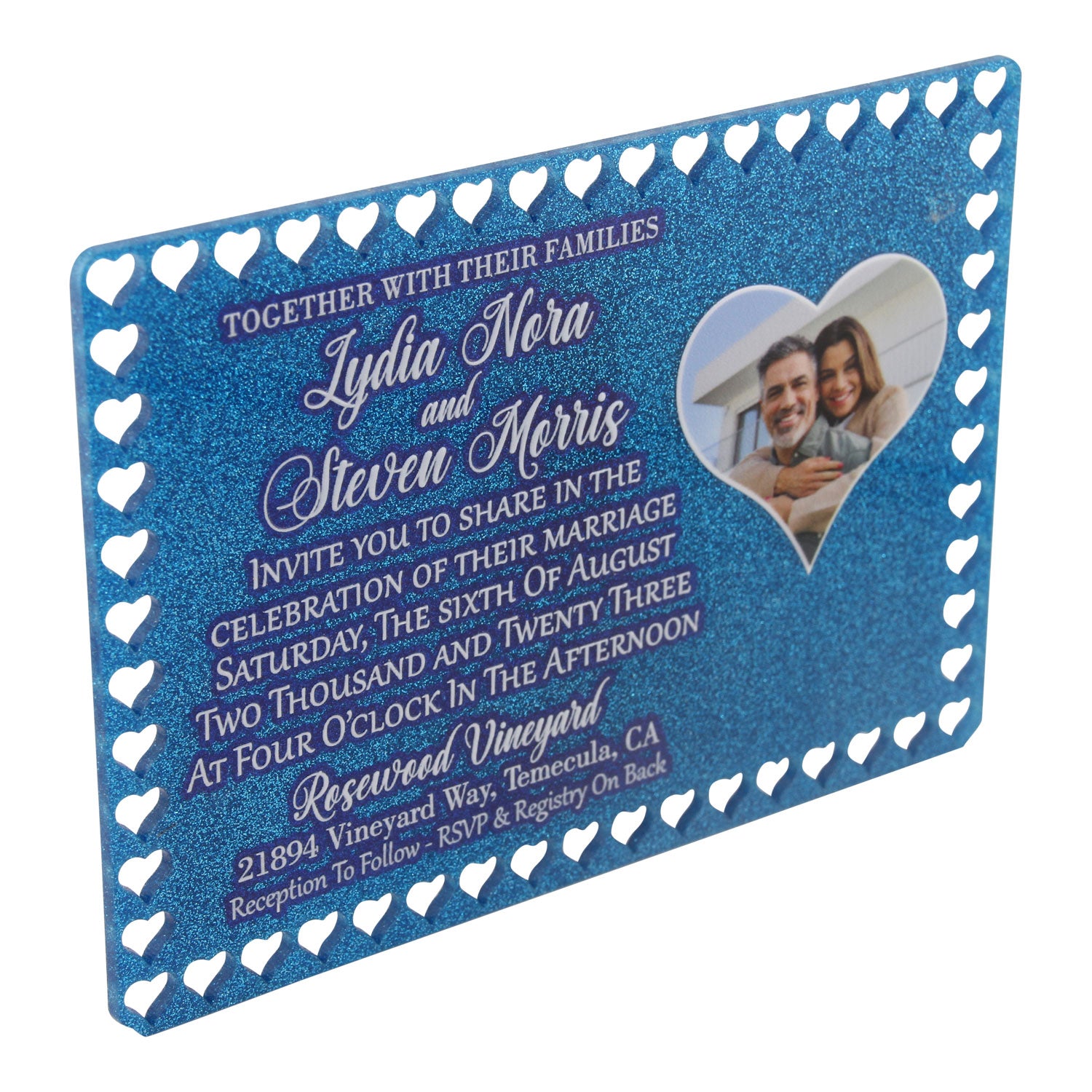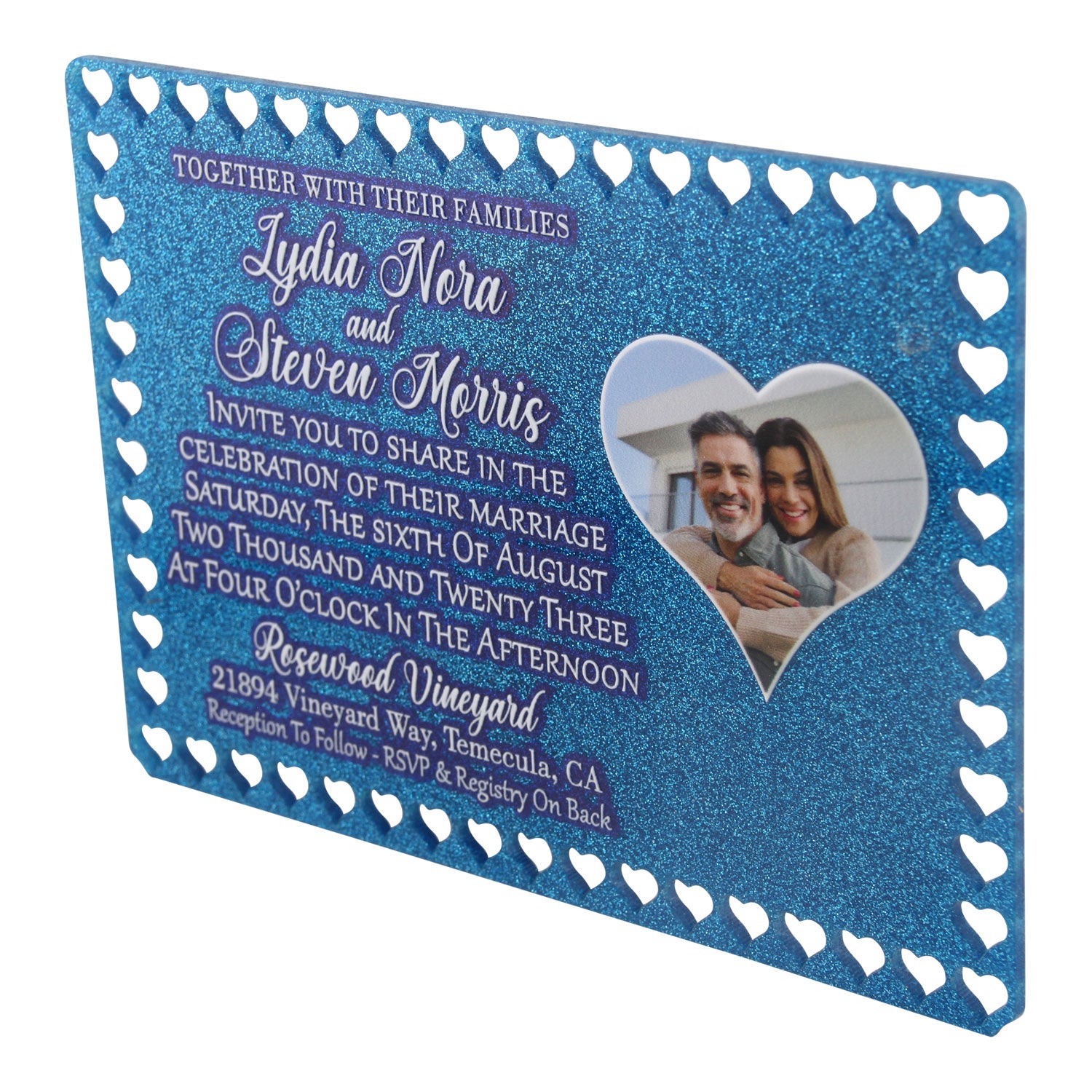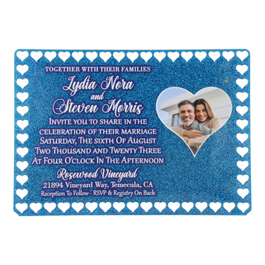 Elevate your special day with our Acrylic Heart Border Cutout Wedding Invitation. Made from high-quality 3mm acrylic, it features a heart cutout border and a heart photo, creating a stunning visual representation of love. The invitation is UV printed with a varnish finish to add a luxurious touch. Radiate elegance and sophistication with this unique wedding invitation.