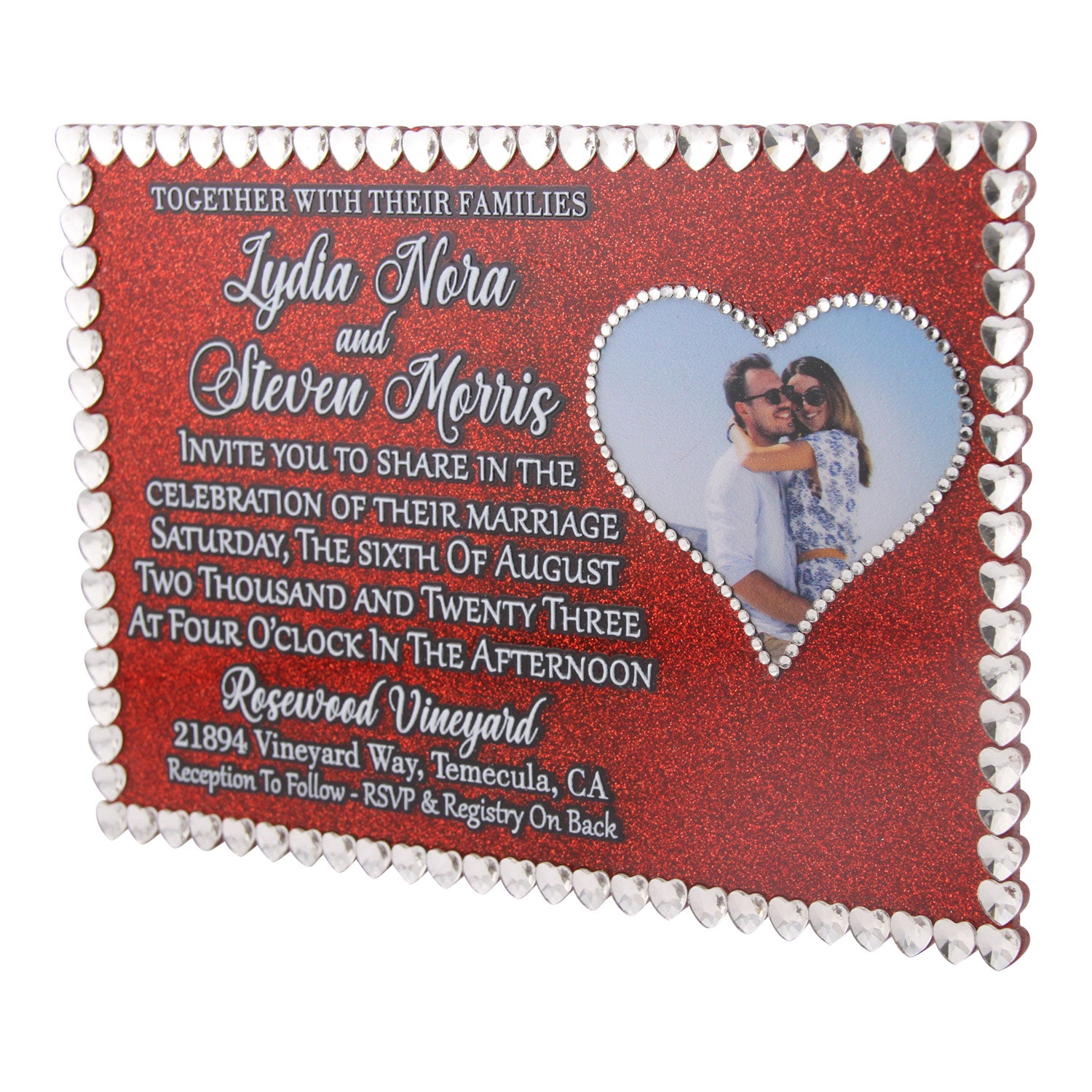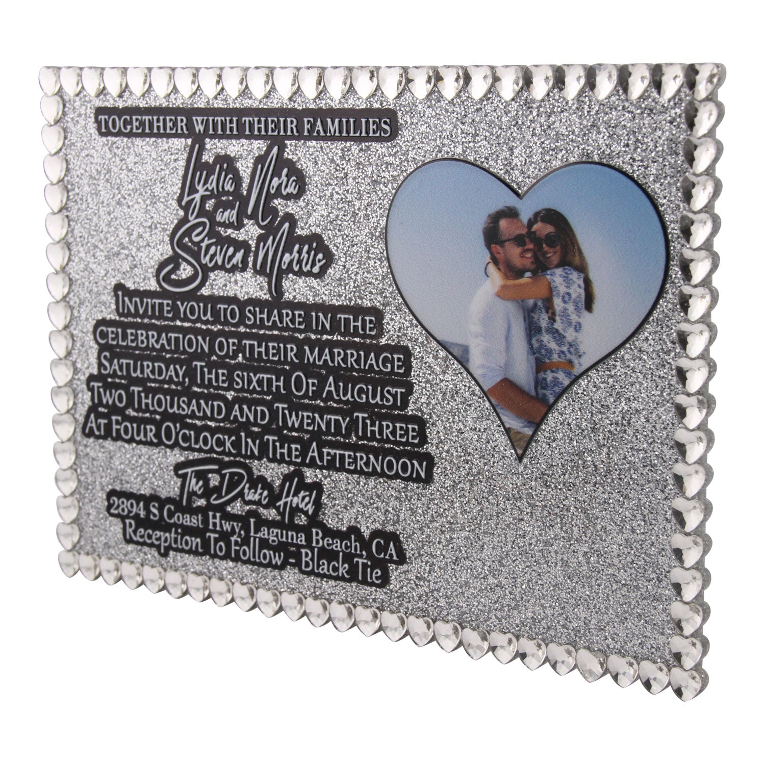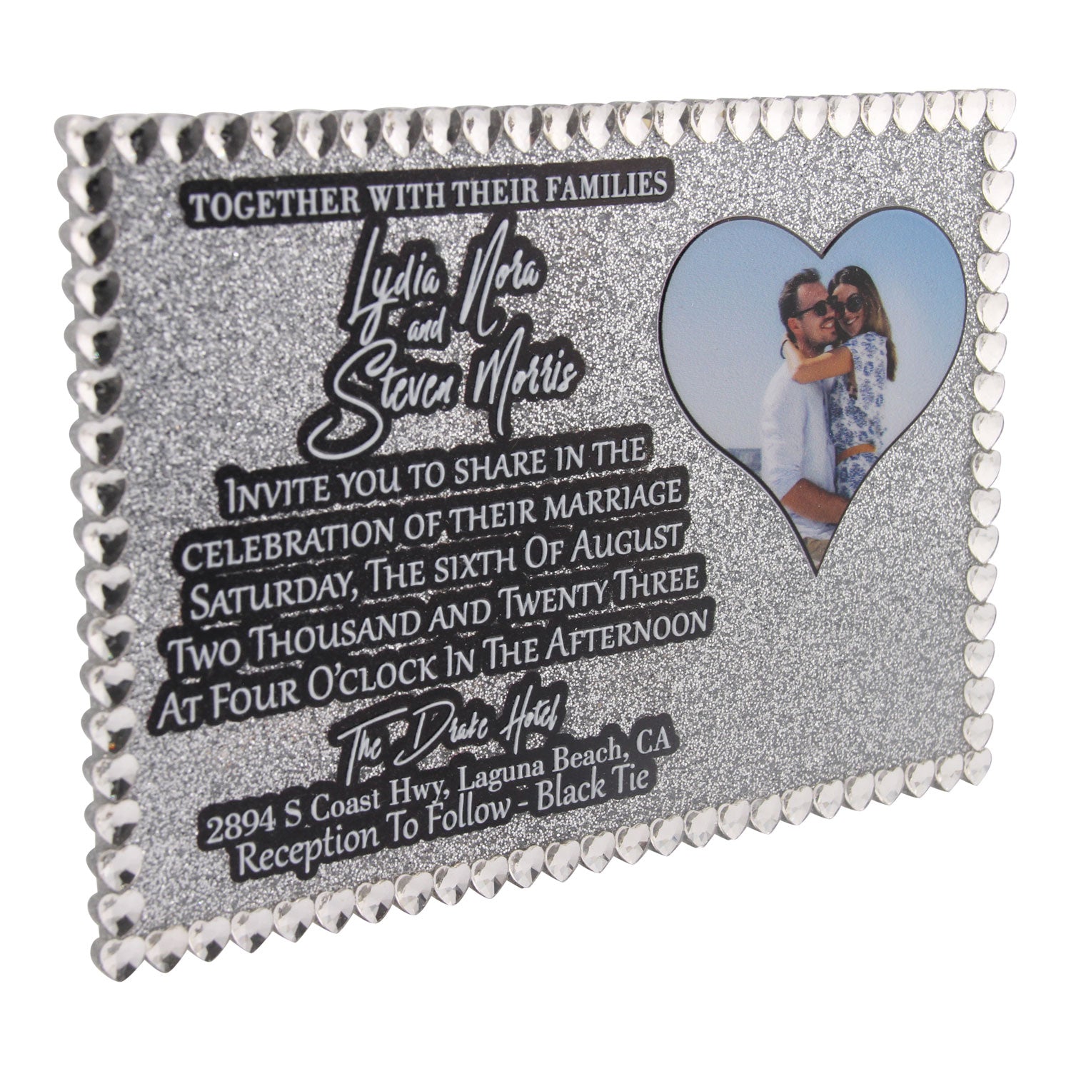 Elevate your special day with our Heart Rhinestone Wedding Invitation. This acrylic invitation boasts a hand-placed rhinestone heart border, LED UV printed text, and a customizable heart photo. Choose from 38 stunning 3mm acrylic colors to create an exclusive and sophisticated invitation that will impress your guests.