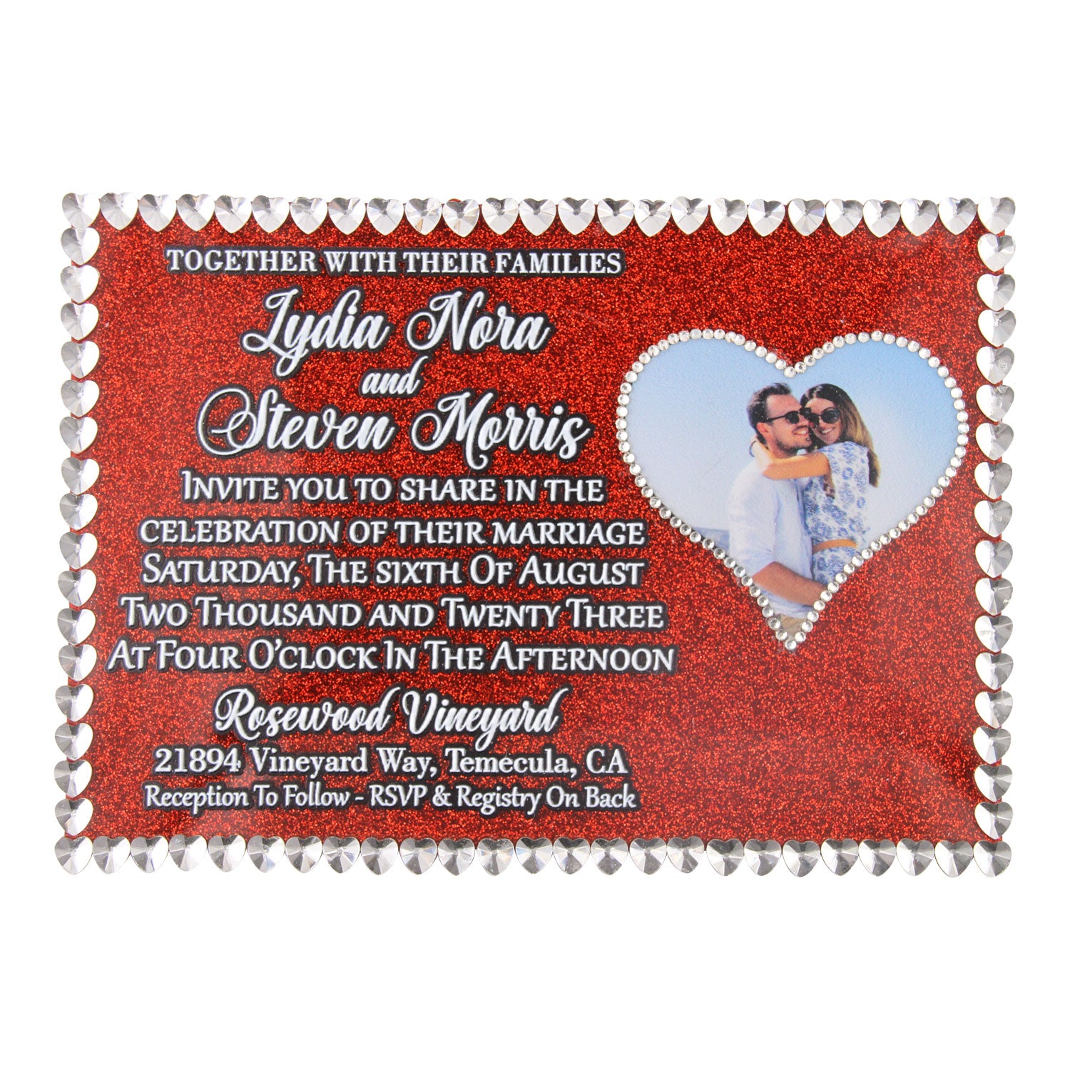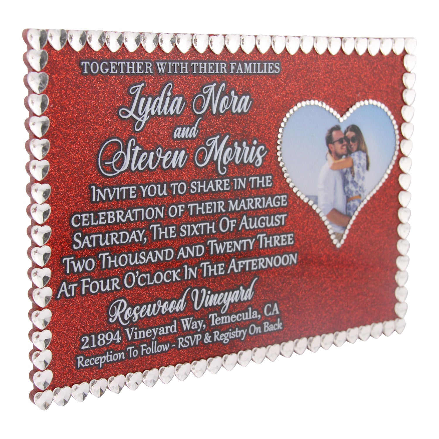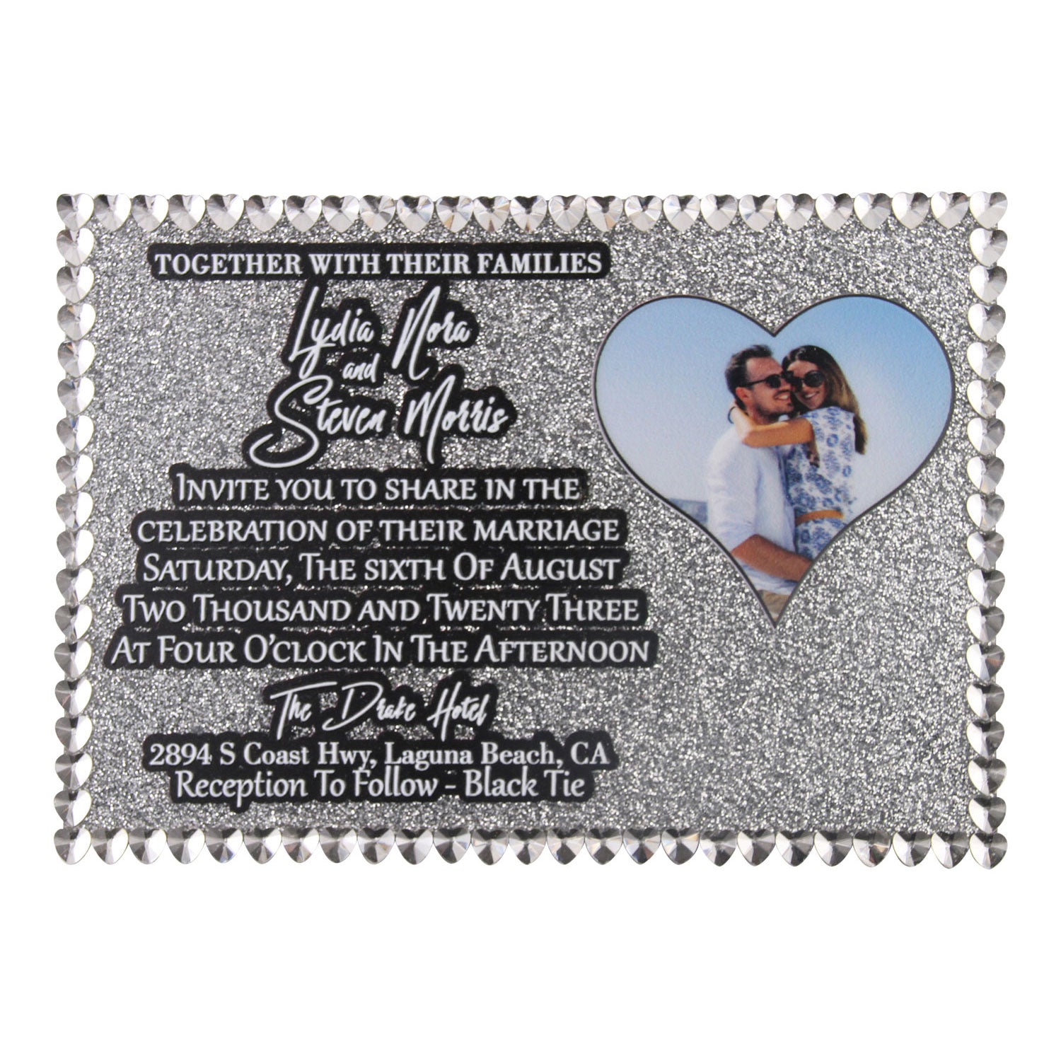 Elevate your special day with our Heart Rhinestone Wedding Invitation. This acrylic invitation boasts a hand-placed rhinestone heart border, LED UV printed text, and a customizable heart photo. Choose from 38 stunning 3mm acrylic colors to create an exclusive and sophisticated invitation that will impress your guests.