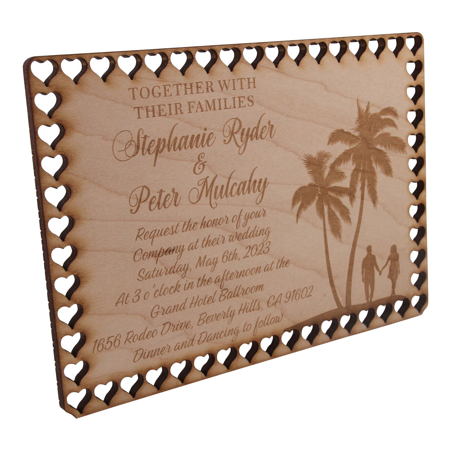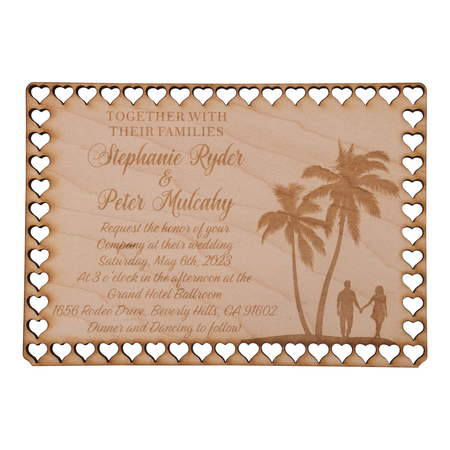 Exquisitely crafted with meticulous care, our Maple Wedding Invitation Heart Cut Out Border showcases an intricate laser cut heart border and laser engraved text. The detailed design is enhanced by palm trees and a couple, all presented on high-quality 5mm maple wood. An opulent selection for your wedding day. Choose between laser engraved text or LED UV printed text with varnish. Dimensions 5"x7".